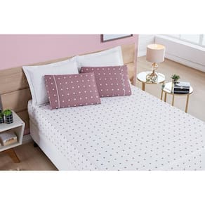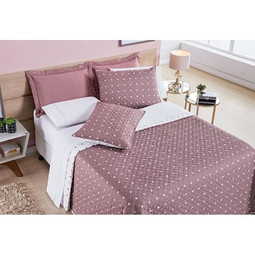 Coordenado de cobre leito casal e lençol poá 6 peças 200 fios Coordenado póa casal: rosê A coleção petit poá aposta no clássico, no simples. Uma Coleção romântica, elegante e atual onde as bolinhas são As protagonistas.