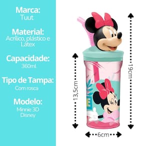 Tampa temática: A tampa de rosca conta com um detalhe 3D do rosto da Minnie em látex, tornando o copo ainda mais especial e divertido.