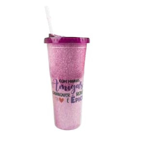 Copo Canudo Com Glitter Amigas Rosa 650Ml