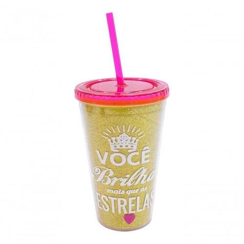 Copo com canudo exclusivo do Projeto Kiwi. Corpo todo dourado brilhante, escrito Você brilha mais que estrelas, tampa e canudo na cor pink. Material: plástico