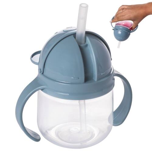 Caneca de Treinamento Incolor com tampa Azul e canudo de acionamento automático. A tampa superior de proteção é fixa e um movimento de vai e vem garante que na medida em que é movimentada, o canudo flexível retrai e surge pronto para o uso.