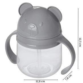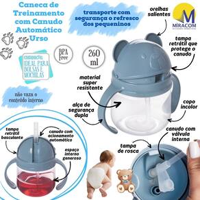 Esta caneca infantil tem capacidade para 260ml e é produzida em polipropileno de alta densidade, atóxico e livre de BPA em sua composição (BPA Free), possibilitando inclusive ser levada ao freezer e ao micro-ondas. A tampa de reabastecimento tem sistema antivazamento e tem fechamento por rosca, tornando a experiência mais segura. O canudo retrátil é produzido em silicone flexível incolor atóxico e ainda conta com um sistema de válvula de "respiro" para facilitar a sucção da criança. A tampa superior conta com componentes lúdicos em formato de urso com orelhas salientes para despertar a atenção e incentivar o hábito da hidratação desde cedo. As alças são interligadas à tampa principal, garantindo firmeza e transmitindo segurança aos bebês durante o período de transição da mamadeira para copos e canecas.