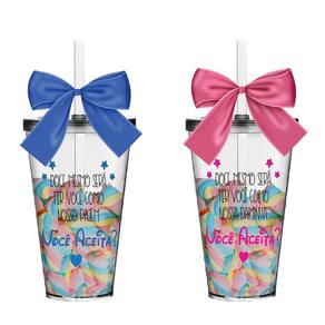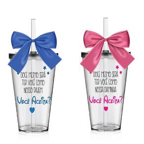 Torne cada momento da preparação para seu casamento um momento especial, iniciando com os pequenos com o Copo Convite para Pajem e Daminha. O kit acompanha duas unidades, um para o pajem e um para a daminha, com a mensagem "doce mesmo será ter você como nosso pajem daminha você aceita?". Os copos são uma forma linda e deliciosa de convidar ou agradecer a quem topou fazer parte desta data tão especial. Com capacidade para 550ml você pode encher os copos com o doce favorito das crianças e encantá-los, o sim deles é garantido. Características - 2 Copos nas cores rosa e azul - Canudo transparente com laço de cetim - Ideal para convidar as crianças para serem pajem e daminha no seu casamento - Mensagem "doce mesmo será ter você como nosso pajem daminha você aceita?" Especificações Capacidade: 550 ml Material Copo: Acrílico Poliestireno Resistente Laço: Cetim Cor do Copo: Transparente Tampa e Canudo: Transparente Estampa: Transfer Aplicação Direto no Produto Quantidade: 2 Peças Conteúdo: 02 Copos Convite com Tampa e Canudo Transparentes com 1 Laço em Cetim Rosa e 1 Laço em Cetim Azul. Ean: 7897581921731