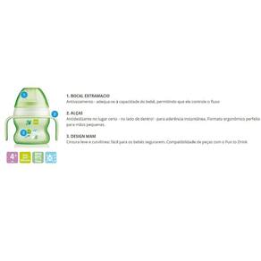 Características: 1. BOCAL EXTRAMACIO Antivazamento - adequa-se à capacidade do bebê, permitindo que ele controle o fluxo 2. ALÇAS Antideslizante no lugar certo - no lado de dentro! - para aderência instantânea. Formato ergonômico perfeito para mãos pequenas 3. DESIGN MAM Cintura leve e curvilínea: fácil para os bebés segurarem. Compatibilidade de peças com o Fun to Drink