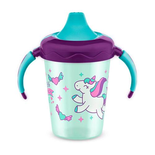 Colabora para que o processo de transição da mamadeira para a caneca ocorra naturalmente. Seu bebedor em material macio possui válvula com sistema antivazamento que impede que o líquido saia sem que a criança sugue, proporcionando a deglutição segura.