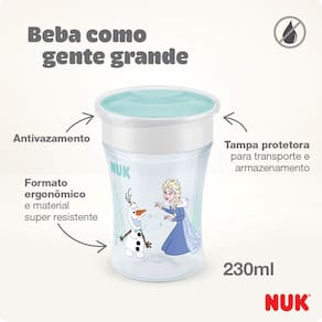 O Copo Magic Cup 360° Evolution Frozen da NUK foi desenvolvido para tornar a fase de transição do bebê para o uso do copo convencional mais prática, segura e divertida. Com design exclusivo inspirado no universo Frozen, ele estimula a autonomia da criança enquanto acompanha seu desenvolvimento com conforto e praticidade.