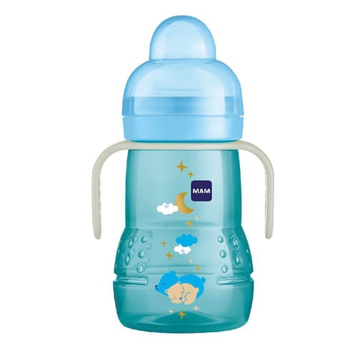 Suas alças brilham no escuro, especialmente desenhadas para as pequenas mãos das crianças e são compatíveis com todas as mamadeiras MAM.