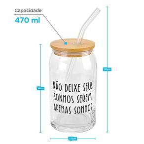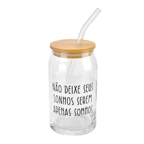 - Capacidade 470ml - Design Atraente: frases para inspirar seus dias. - Material eco: Vidro e tampa de bambu durável - Praticidade: Canudo de vidro incluído. - Versatilidade: Perfeito para sucos, smoothies e outras bebidas refrescantes. Marca: Não Informado