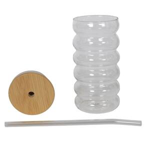 Copo de Vidro Ondulado Premium com Tampa de Madeira e Canudo - 550ml