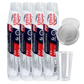 Copo e tampa c/furo 400ml descartável liso c/200 chopp suco Copo descartável 400ml com tampa com furo pp transparente pacote c/200 copos e 200 tampas ultratherm.