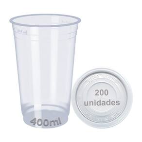 Copo e tampa c/furo 400ml descartável liso c/200 chopp suco Copo descartável 400ml com tampa com furo pp transparente pacote c/200 copos e 200 tampas ultratherm.