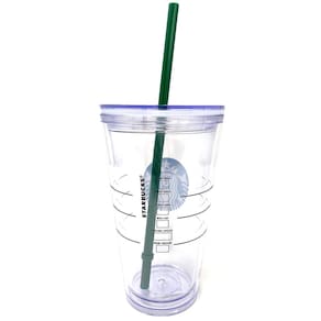 Starbucks Copo grande velho transparente de 680 g. Tampa de parafuso transparente com vedação de borracha. Palha verde e logotipo verde.