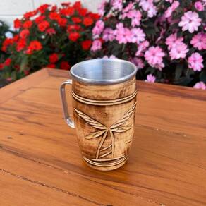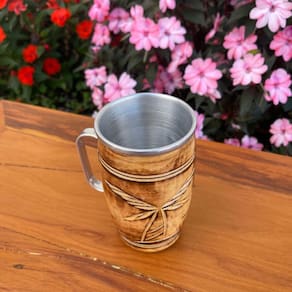 A Caneca de madeira e Alumínio é ideal para qualquer tipo de bebida. Feito em madeira maciça com acabamento em verniz e com revestimento em alumínio.