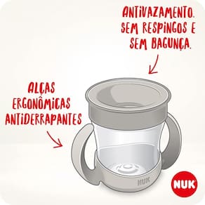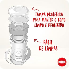 Suas alças antiderrapantes são ergonômicas e supermodernas, ideais para as mãos das crianças. O sistema intercambiável permite que todas as peças sejam trocadas entre os frascos da linha NUK Evolution. O copo NUK Evolution Mini Magic Cup possui tampa protetora, foi desenvolvido na Alemanha, é produzido em material super resistente e BPA Free.