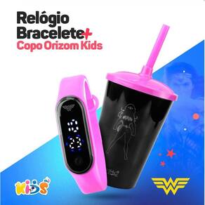 Copo mulher maravilha prova dagua + relogio digital infantil silicone rosa adolescente menina data