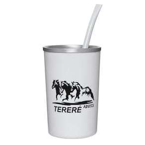 Copo para tereré Rodeo West fabricado em alumínio com revestimento em plástico na parte externa na cor Branco com estampa. Acompanha bomba de alumínio com bojo modelo pêra.
