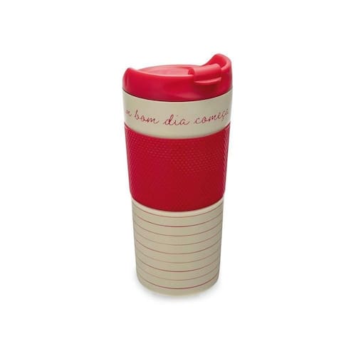 Todo em off-white e contando com detalhes em vermelho, essa belezinha traz uma faixa de silicone, pensada para te oferecer mais conforto na hora de desfrutar suas bebidas. Além disso, ele conta com capacidade para 360 ml e mantém a sua bebida quente por até 3 horas.