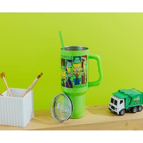 - TURTLE POWER: o copo temático apresenta Teenage Mutant Ninja Turtles, incluindo Leonardo, Donatello, Raphael e Michelangelo. Cada personagem é apresentado em um retângulo individual em uma pose incrível. Escrito no copo está “Turtle Power”. O design é apresentado em ambos os lados do copo verde.