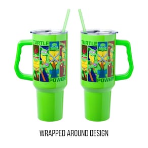 Copo de aço inoxidável Silver Buffalo Teenage Mutant Ninja Turtles Turtle Power com alça com Leonardo, Donatello, Raphael e Michelangelo, cabe em porta-copos padrão, 40 onças