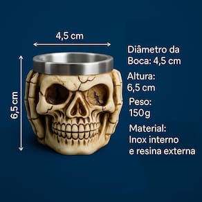 Altura: 6,5 cm Diâmetro da Boca: 4,5 cm Peso: 150 g Aproximadamente 45ML Material: Inox interno + Resina externo