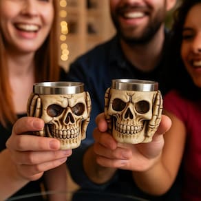 Design exclusivo de caveira com mãos tampando os ouvidos Interior em inox: resistente e fácil de limpar Presente criativo para ocasiões especiais Ótima peça decorativa e funcional