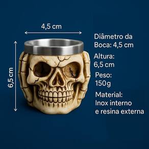 Altura: 6,5 cm Diâmetro da Boca: 4,5 cm Peso: 150 g Aproximadamente 45ML Material: Inox interno + Resina externo