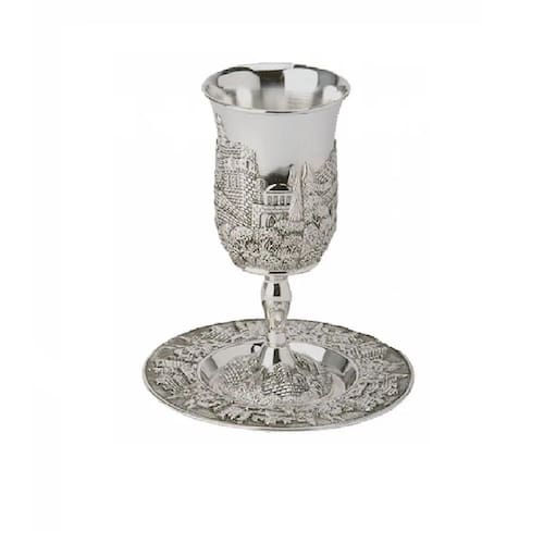 Absolutamente deslumbrante copa do kidush de jerusalém com as muralhas da cidade velha de jerusalém, a torre de davi e 'borei pri hagefen' escrito em hebraico.