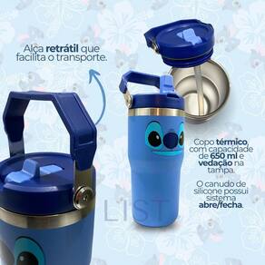 Copo Tumbler 650 ML Personagens Copo Garrafa Térmica Stitch - 650ml Inox com Tampa de Vedação, Canudo de Silicone e Alça Retrátil Hidrate-se com muito mais estilo e praticidade com o copo garrafa térmica do Stitch Ideal para levar bebidas para a escola, trabalho, academia, passeios ou viagens, ele combina funcionalidade, resistência e um design superfofo do personagem mais amado da Disney. Características do Produto:
