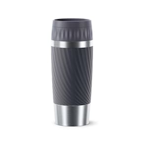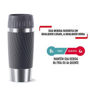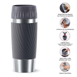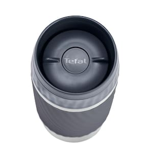 Desfrute de suas bebidas favoritas em qualquer lugar e a qualquer hora com o Copo Térmico com Tampa Tefal Easy Twist Cinza de 360ml, que conta com um design inovador. A tampa giratória facilita o processo de abrir e fechar para colocar sua bebida e garante fechamento seguro para não vazar. Botão abre e fecha fácil com apenas um ""clic"", centralizado na tampa para não entrar em contato com a sua bebida. Com uma capacidade de 360ml, possui um formato que se encaixa nos porta-copos de carros, além do acabamento em silicone que proporciona mais firmeza ao segurar e uma base antiderrapante para maior estabilidade. Feita em aço inoxidável, um material isolante térmico e resistente, este copo mantém suas bebidas por até 8 horas frias ou 4 horas quentes. A facilidade de limpeza é garantida pela tampa desmontável de duas partes, sendo ainda possível lavá-la na máquina de lavar louça. Livre de BPA e com garantia de cinco anos, oferece tranquilidade e confiança aos usuários. Diferenciais: - Abre fácil, com apenas um ""clic"" - Mantém sua bebida 8h fria ou 4h quente. - À prova de vazamentos. - Acabamento em silicone, muito mais firmeza. - Tampa giratória: Facilita o processo de abrir e fechar para colocar sua bebida. - Aço inoxidável: Material com isolamento térmico e resistente. Desfrute da sua bebida favorita em qualquer lugar, a qualquer hora, com o Copo Térmico com Tampa Tefal Easy Twist Cinza de 360ml.