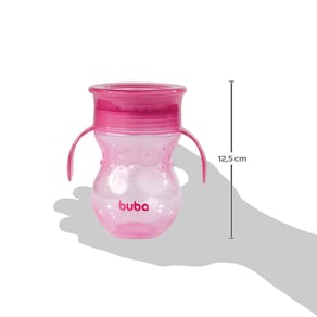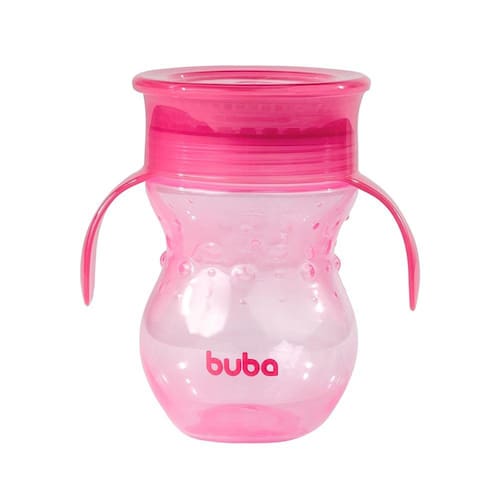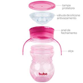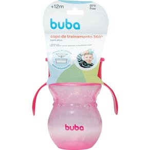 O Copo de treinamento Buba 360° antivazamento foi elaborado na transição natural entre bicos para o copo tradicional, imitando a movimentação e inclinação para saída do fluxo. A diferença é sua válvula 360° que evita o derramamento de líquidos mas que possibilita a ingestão por toda borda.