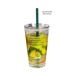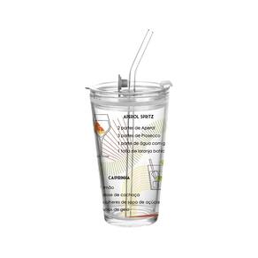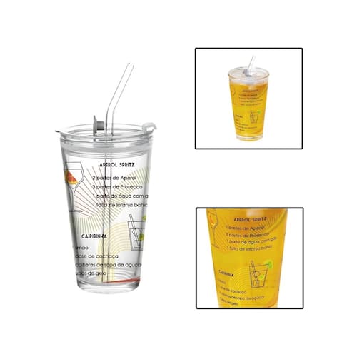 Copo de vidro 450 ml com tampa e canudo reutilizável de vidro, prático para sucos e drinks. As receitas impressas no corpo ajudam na preparação e deixam a apresentação mais divertida. Ideal para uso diário em casa, no trabalho ou em eventos, com limpeza simples e visual transparente.