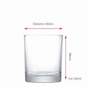 Indicado para: Whisky Material: Vidro Capacidade: 340ml Referência: 21073100006 Medidas: diâmetro 82mm x altura 98mm • Peças medidas com o volume máximo até a boca • Pode sofrer variação de até 10% de seu volume • Diâmetro é medido pela largura maior da peça