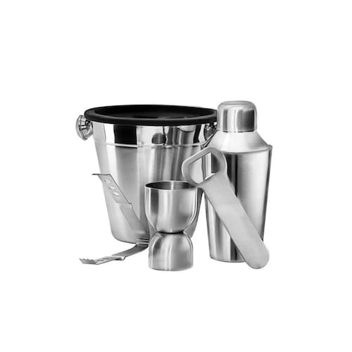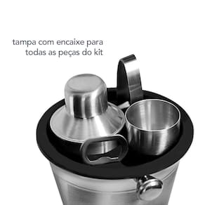 Coqueteleira, balde de gelo, copo dosador, pegador e abridor. O kit bar é perfeito para presentear iniciantes de coqueteis, entusiastas e profissionais. Todas as peças sao em aço inox, o que proporciona mais elegancia, sofisticaçao e durabilidade ao kit bar.