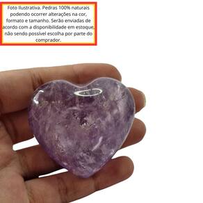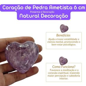 Coração de Pedra Ametista 6 cm Natural Decoração Coração de Pedra Ametista 6 cm Natural - Decoração Traga mais beleza e energia positiva para o seu ambiente com o Coração de Pedra Ametista. Com 6 cm de altura, essa peça natural é perfeita para decoração, oferecendo elegância e poder curativo. Benefícios do Coração de Pedra Ametista: Equilíbrio emocional: A Ametista é conhecida por sua capacidade de trazer paz interior, equilíbrio e clareza emocional. Proteção energética: Ela ajuda a proteger contra energias negativas, criando um campo energético seguro e positivo ao redor. Estimula a espiritualidade: Favorece a meditação e a conexão espiritual, trazendo maior percepção e sabedoria interior. Atenção: Foto Ilustrativa. Pedras 100% naturais, podendo ocorrer alterações na cor, formato e tamanho. Serão enviadas de acordo com a disponibilidade em , não sendo possível escolha por parte do comprador. Marca: Não Informado