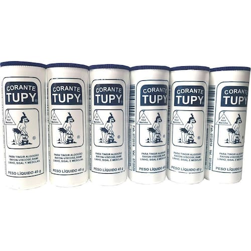 Corante Em Pó Azul Marinho Tupy Algodão O Corante Tupy é um corante de composição orgânica, tendo o seu pH, em média, neutro, quando dissolvido em água quente, não apresenta odor e sua forma física é sólida e não apresenta característica tóxica. Indicado para tingir tecidos ou fibras de algodão, linho, sisal, rami, rayon-viscose e mesclas. Dimensões : 19x3x8,5 cm 45 g cada tubo Peso: 0,600 kg Composição: 6 tubos de tinta Ean: 7897568500232