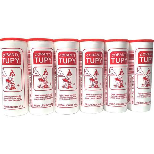 Corante Em Po Vermelho Tupy Algodão O Corante Tupy é um corante de composição orgânica, tendo o seu pH, em média, neutro, quando dissolvido em água quente, não apresenta odor e sua forma física é sólida e não apresenta característica tóxica. Indicado para tingir tecidos ou fibras de algodão, linho, sisal, rami, rayon-viscose e mesclas. Pacote com 6 tubos de tinta na cor vermelha para tingir roupas algodão, rayon-viscose, rami, linho, sisal e mesclas Dimensões : 19x3x8,5 cm 45 g cada tubo Peso: 0,600 kg Composição: 6 tubos de tinta. Marca: Não Informado Ean: 7897568500157