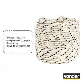 Características - Diâmetro da corda: 10,0 mm - Comprimento total da corda: 110 metros - Cor da corda: Branca com detalhes em amarelo e preto - Tipo de filamento da corda: Multifilamento - Tipo de encordamento: Trançado