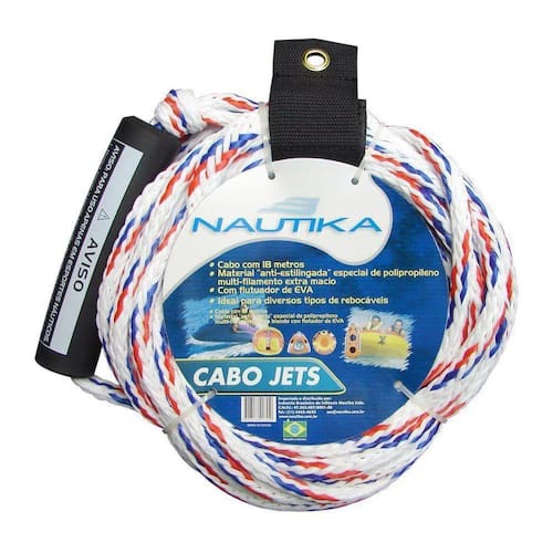 Caracteristicas: Cabo de reboque para esportes aquáticos. ( Jet Bob, Jet Duo, Jet Disk e outros) Material: 100% polipropileno multi-filamento material ?Anti-estilingada? Medida aproximada: 18 metros Reforçado e confortável Corda de polipropileno multi-filamento evita o efeito ?estilingada? Inclui flutuador em EVA para maior segurança e visibilidade.