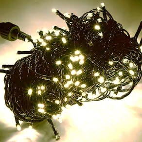 Luz de Natal Cordão 100 Lâmpadas LED Warm com 20 Strobos Warm Fio Verde EXTERNO Tomada Macho/Femea Voltagem Bivolt Potência 3.6W Medida 10m REF 31101