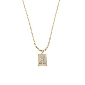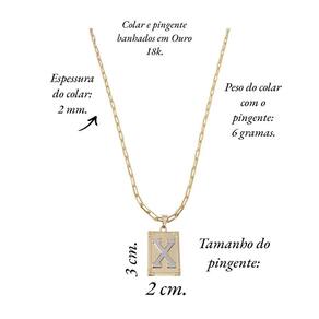 Corrente Colar Cordão modelo unissex pingente letra inicial X banhado em Ouro 18k. Colar com Pingente Retangular banhado em Ouro 18k, com acabamento impecável em Ródio branco que destaca ainda mais a beleza da peça. O centro do pingente traz uma letra inicial personalizada, tornando-o uma joia exclusiva e carregada de significado. Delicado e sofisticado, este colar é perfeito para quem busca elegância e personalização em um só acessório, ideal para presentear ou usar em ocasiões especiais. Especificações do produto: Colar banhado a Ouro 18k. Antialérgico. Modelo do fecho do colar: lagosta. Espessura do colar: 2 mm. Peso do colar com o pingente: 6 g. Pingente letra inicial retangular com detalhes em Ródio branco banhado a Ouro 18k. Tamanho do pingente: 3 cm altura x 2 cm largura. Acompanha linda caixinha de presentes. Seguindo nossas orientações de uso no certificado de garantia a joia permanecerá conservada por longos anos ou até décadas Marca: Anaisa Semijoias