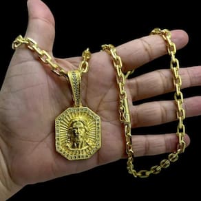 Cordão 6mm Cadeado + Pingente Jesus Face - Banhado a ouro Detalhes do Produto: Material: ligas metálicas de alta qualidade, especialmente tratadas para fixação e absorção do ouro, com acabamento em verniz protetor. Aparência: visual idêntico ao ouro maciço. Produção: artesanal, com atenção meticulosa aos detalhes. Banho: 10 camadas espessas de ouro 18k, finalizadas com verniz antialérgico . Elos: soldados varia conforme o modelo . Pedras: zircônias brilhantes cravejadas quando aplicável . Tamanhos Disponíveis: Cordões Masculinos: 70cm padrão e 60cm sob consulta/Pedido Via Chat . Cordões Femininos: 50cm padrão e 45cm sob consulta/Pedido Via Chat . Pulseiras: 21cm padrão ; tamanhos de 18cm a 23cm sob consulta/Pedido Via Chat. Pingentes: conforme imagens; consulte para mais detalhes via chat. Espessuras Recomendadas para Cordões / Pingentes: P: 1mm a 4mm M: 4mm a 8mm G: 6mm a 13mm Gg: 12mm a 18mm Incluso na Compra: Saquinho de organza para armazenamento seguro. Caixa elegante, perfeita para presente. Cupom de desconto para a próxima compra. Flyer com outros produtos da coleção. Carta de agradecimento personalizada. Adesivo da marca ToJoia18k. Informações Adicionais: : 6 meses termos acompanham o produto . Devolução: 7 dias para devolução sem questionamentos. Envio: despacho em até 24 horas úteis após confirmação do pagamento. Cuidados com a Peça: Evite contato com produtos químicos; aguarde o perfume secar antes de usar. Evite contato com shampoo, condicionadores e suor excessivo. Armazene em local seco, preferencialmente no saquinho de organza fornecido. Uso no mar e piscina é permitido; lave com água corrente e sabão neutro após. Por que Escolher a ToJoia18k Semi-joias luxuosas que combinam estilo, qualidade e sofisticação. Banho espesso de ouro 18k, garantindo brilho duradouro e acabamento impecável. Design exclusivo e produção artesanal, perfeitos para qualquer ocasião. Materiais premium que asseguram durabilidade. Ao escolher uma semi-joia ToJoia18k, você investe em qualidade, elegância e uma experiência única. Aguardamos sua compra Observação: pode ocorrer variação no fecho raramente . Imagens reais, sem edição. Qualquer dúvida, estamos à disposição para esclarecimentos. Marca: Tojoia18K