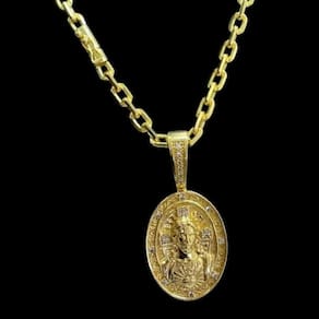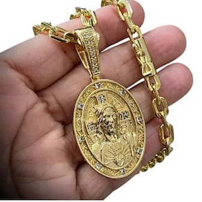 Cordão 6mm Cadeado + Pingente Jesus Oval - Banhado a ouro Detalhes do Produto: Material: ligas metálicas de alta qualidade, especialmente tratadas para fixação e absorção do ouro, com acabamento em verniz protetor. Aparência: visual idêntico ao ouro maciço. Produção: artesanal, com atenção meticulosa aos detalhes. Banho: 10 camadas espessas de ouro 18k, finalizadas com verniz antialérgico . Elos: soldados varia conforme o modelo . Pedras: zircônias brilhantes cravejadas quando aplicável . Tamanhos Disponíveis: Cordões Masculinos: 70cm padrão e 60cm sob consulta/Pedido Via Chat . Cordões Femininos: 50cm padrão e 45cm sob consulta/Pedido Via Chat . Pulseiras: 21cm padrão ; tamanhos de 18cm a 23cm sob consulta/Pedido Via Chat. Pingentes: conforme imagens; consulte para mais detalhes via chat. Espessuras Recomendadas para Cordões / Pingentes: P: 1mm a 4mm M: 4mm a 8mm G: 6mm a 13mm Gg: 12mm a 18mm Incluso na Compra: Saquinho de organza para armazenamento seguro. Caixa elegante, perfeita para presente. Cupom de desconto para a próxima compra. Flyer com outros produtos da coleção. Carta de agradecimento personalizada. Adesivo da marca ToJoia18k. Informações Adicionais: : 6 meses termos acompanham o produto . Devolução: 7 dias para devolução sem questionamentos. Envio: despacho em até 24 horas úteis após confirmação do pagamento. Cuidados com a Peça: Evite contato com produtos químicos; aguarde o perfume secar antes de usar. Evite contato com shampoo, condicionadores e suor excessivo. Armazene em local seco, preferencialmente no saquinho de organza fornecido. Uso no mar e piscina é permitido; lave com água corrente e sabão neutro após. Por que Escolher a ToJoia18k Semi-joias luxuosas que combinam estilo, qualidade e sofisticação. Banho espesso de ouro 18k, garantindo brilho duradouro e acabamento impecável. Design exclusivo e produção artesanal, perfeitos para qualquer ocasião. Materiais premium que asseguram durabilidade. Ao escolher uma semi-joia ToJoia18k, você investe em qualidade, elegância e uma experiência única. Aguardamos sua compra Observação: pode ocorrer variação no fecho raramente . Imagens reais, sem edição. Qualquer dúvida, estamos à disposição para esclarecimentos. Marca: Tojoia18K