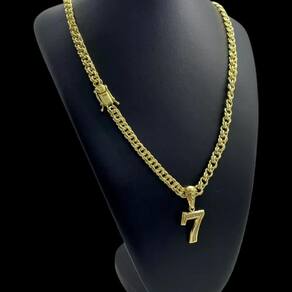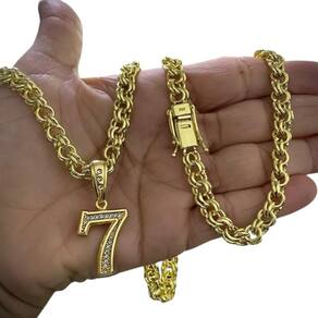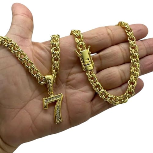 Cordão 8mm Friso + Pingente 7 - Banhado a ouro Detalhes do Produto: Material: ligas metálicas de alta qualidade, especialmente tratadas para fixação e absorção do ouro, com acabamento em verniz protetor. Aparência: visual idêntico ao ouro maciço. Produção: artesanal, com atenção meticulosa aos detalhes. Banho: 10 camadas espessas de ouro 18k, finalizadas com verniz antialérgico . Elos: soldados varia conforme o modelo . Pedras: zircônias brilhantes cravejadas quando aplicável . Tamanhos Disponíveis: Cordões Masculinos: 70cm padrão e 60cm sob consulta/Pedido Via Chat . Cordões Femininos: 50cm padrão e 45cm sob consulta/Pedido Via Chat . Pulseiras: 21cm padrão ; tamanhos de 18cm a 23cm sob consulta/Pedido Via Chat. Pingentes: conforme imagens; consulte para mais detalhes via chat. Espessuras Recomendadas para Cordões / Pingentes: P: 1mm a 4mm M: 4mm a 8mm G: 6mm a 13mm Gg: 12mm a 18mm Incluso na Compra: Saquinho de organza para armazenamento seguro. Caixa elegante, perfeita para presente. Cupom de desconto para a próxima compra. Flyer com outros produtos da coleção. Carta de agradecimento personalizada. Adesivo da marca ToJoia18k. Informações Adicionais: : 6 meses termos acompanham o produto . Devolução: 7 dias para devolução sem questionamentos. Envio: despacho em até 24 horas úteis após confirmação do pagamento. Cuidados com a Peça: Evite contato com produtos químicos; aguarde o perfume secar antes de usar. Evite contato com shampoo, condicionadores e suor excessivo. Armazene em local seco, preferencialmente no saquinho de organza fornecido. Uso no mar e piscina é permitido; lave com água corrente e sabão neutro após. Por que Escolher a ToJoia18k Semi-joias luxuosas que combinam estilo, qualidade e sofisticação. Banho espesso de ouro 18k, garantindo brilho duradouro e acabamento impecável. Design exclusivo e produção artesanal, perfeitos para qualquer ocasião. Materiais premium que asseguram durabilidade. Ao escolher uma semi-joia ToJoia18k, você investe em qualidade, elegância e uma experiência única. Aguardamos sua compra Observação: pode ocorrer variação no fecho raramente . Imagens reais, sem edição. Qualquer dúvida, estamos à disposição para esclarecimentos. Marca: Tojoia18K