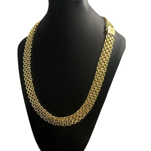 Cordão Cadeado Quádruplo 16mm - Banhado a Ouro 18k Detalhes do Produto: Material: ligas metálicas de alta qualidade, especialmente tratadas para fixação e absorção do ouro, com acabamento em verniz protetor. Aparência: visual idêntico ao ouro maciço. Produção: artesanal, com atenção meticulosa aos detalhes. Banho: 10 camadas espessas de ouro 18k, finalizadas com verniz antialérgico . Elos: soldados varia conforme o modelo . Pedras: zircônias brilhantes cravejadas quando aplicável . Tamanhos Disponíveis: Cordões Masculinos: 70cm padrão e 60cm sob consulta/Pedido Via Chat . Cordões Femininos: 50cm padrão e 45cm sob consulta/Pedido Via Chat . Pulseiras: 21cm padrão ; tamanhos de 18cm a 23cm sob consulta/Pedido Via Chat. Pingentes: conforme imagens; consulte para mais detalhes via chat. Espessuras Recomendadas para Cordões / Pingentes: P: 1mm a 4mm M: 4mm a 8mm G: 6mm a 13mm Gg: 12mm a 18mm Incluso na Compra: Saquinho de organza para armazenamento seguro. Caixa elegante, perfeita para presente. Cupom de desconto para a próxima compra. Flyer com outros produtos da coleção. Carta de agradecimento personalizada. Adesivo da marca ToJoia18k. Informações Adicionais: : 6 meses termos acompanham o produto . Devolução: 7 dias para devolução sem questionamentos. Envio: despacho em até 24 horas úteis após confirmação do pagamento. Cuidados com a Peça: Evite contato com produtos químicos; aguarde o perfume secar antes de usar. Evite contato com shampoo, condicionadores e suor excessivo. Armazene em local seco, preferencialmente no saquinho de organza fornecido. Uso no mar e piscina é permitido; lave com água corrente e sabão neutro após. Por que Escolher a ToJoia18k Semi-joias luxuosas que combinam estilo, qualidade e sofisticação. Banho espesso de ouro 18k, garantindo brilho duradouro e acabamento impecável. Design exclusivo e produção artesanal, perfeitos para qualquer ocasião. Materiais premium que asseguram durabilidade. Ao escolher uma semi-joia ToJoia18k, você investe em qualidade, elegância e uma experiência única. Aguardamos sua compra Observação: pode ocorrer variação no fecho raramente . Imagens reais, sem edição. Qualquer dúvida, estamos à disposição para esclarecimentos. Marca: Não Informado