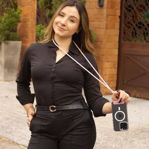 Ele é um cordão de poliéster premium, altamente resistente a torções, puxões e desgastes do uso diário, que permite que você transporte seu smartphone no pescoço de maneira confortável, perfeito para quem precisa manter o aparelho sempre por perto, como em eventos, caminhadas ou situações em que as mãos precisam estar livres.