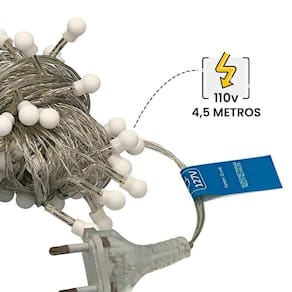 -não instalar em árvores que tenham arranjos, folhas ou galhos revestidos de metal ou metalizados; -não monte ou instale os fios de maneira que os mesmos possam ser danificados ou cortados; -manter fora do alcance de crianças. -4,5 Metros -110v -1,2W -0,02A -tamanho da Bolinha de LED: 1cm