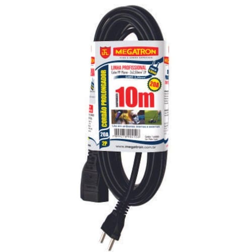 CORDAO PROLONGADOR PP 2X2,50X10,00MT 2P 20A/250V PT MEGATRONApresentamos os cordões prolongadores 20A, produtos de qualidade e que garantem segurança aos usuários, atendendo ao novo padrão brasileiro de plugues e tomadas (NBR 14136).Modelo: Cordão Prolongador 20AAmperagem: 20A / 250VEspessura do cabo: 2,50mm²Número de tomadas: 01*Ideal para: Para prolongar a tomada dos equipamentos para distancias longas, de até 10 metros. É utilizado geralmente em trabalhos com betoneiras, cortadores de gramas, ferramentas, entre outros.**Imagens meramente ilustrativa.*Marca: MegatronCódigo:79871