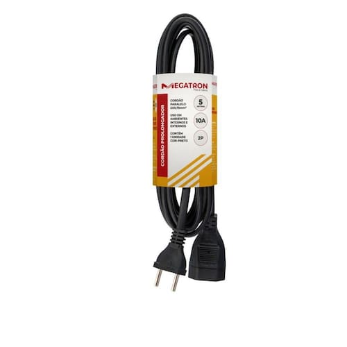 Cordao Prolongador Pp Plano 10a 0,75 5m Preto Apresentamos os cordões prolongadores 10A, produtos de qualidade e que garantem segurança aos usuários, atendendo ao novo padrão brasileiro de plugues e tomadas (NBR 14136). Modelo: Cordão Prolongador 10A Megatron; Amperagem: 10A / 250V; Espessura do cabo: 0,75mm; Número de tomadas: 01; Ideal para: Para prolongar a tomada dos equipamentos para distancias longas; Ean: 7899278904171