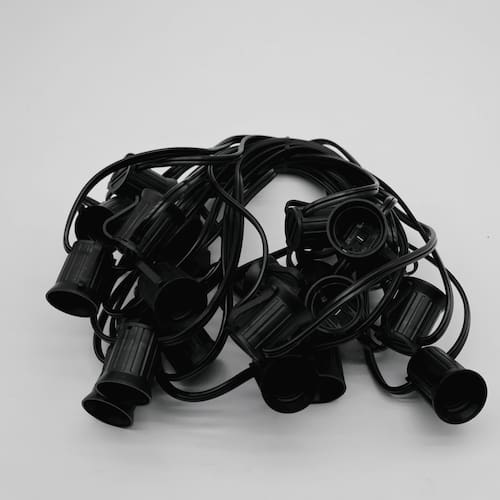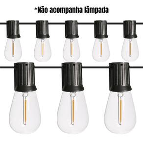 Cód: 80170 Cordão Varal de Luzes Eco Preto 20E27 10M IP54 Soquete: 20*E27 (Lâmpadas não inclusas) Comprimento: 10m Distância entre os soquetes: 45cm Dimensões soquete: 4x3,5cm (AxL) Cor: Preto Tensão: Bivolt *Uso Interno e Externo