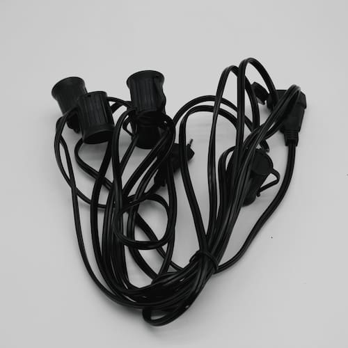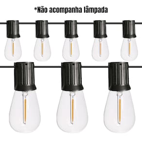Cód: 80168 Cordão Varal de Luzes Eco Preto 5E27 5M IP54 Soquete: 5*E27 (Lâmpadas não inclusas) Comprimento: 5m Distância entre os soquetes: 95cm Dimensões soquete: 4x3,5cm (AxL) Cor: Preto Tensão: Bivolt *Uso Interno e Externo